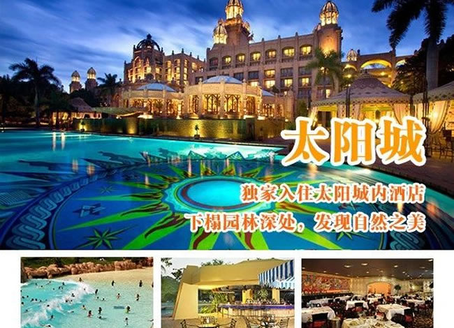 酒店早餐。前往機場,搭乘航班飛往約堡。驅(qū)車前往南半球最大的娛樂中心-太陽城。不曾身臨其境,便無法真正理解太陽城給人所帶來的震撼。將古老傳說的神秘滄桑、非洲大陸的野性粗獷和現(xiàn)代生活的便利舒適那樣完美地融合在一起。你可以在失落城探尋非洲大陸上最古老的秘密,根據(jù)神話傳說興建的地震橋以及豪華賭場、著名的建筑-失落城等。這里有清幽的湖光山色,無數(shù)的珍禽異草,游人可漫步其中享受。(含自由活動游覽時間約3小時) 晚餐后,入住太陽城內(nèi)豪華酒店,您可于太陽城內(nèi)賭場大顯身手。溫馨提示:約堡-太陽城,約210公里,車程約3小時