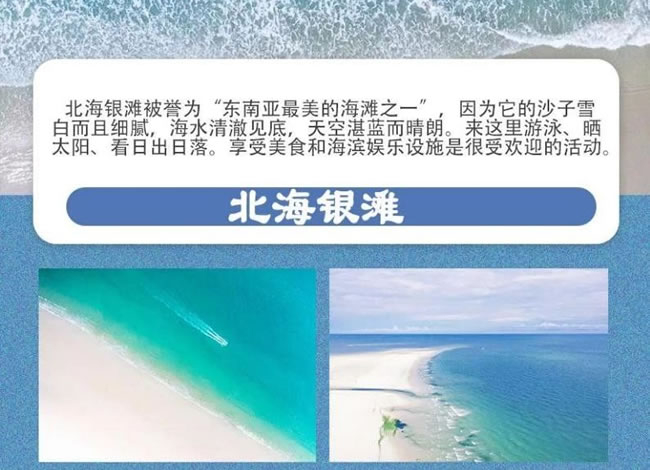 北海銀灘被譽(yù)為“東南亞最美的海灘之一 ”因為它的沙子雪白而且細(xì)膩,海水清 澈見底,天空湛藍(lán)而晴朗。來這里游泳、曬太陽、看日出日落。享受美食和海濱 娛樂設(shè)施是很受歡迎的活動
