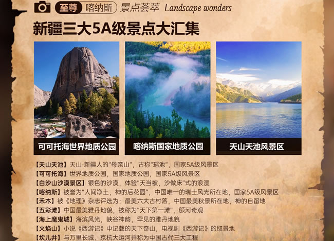 【白沙山沙漠】(贈送,游覽約1小時)白沙山意為銀色的沙漠,只有460米高,高度上在帕米爾高原上確實比較弱,但白沙山長度卻綿延1200米,每當(dāng)有勁風(fēng)吹來,白沙山都會發(fā)出響聲,故而又被稱作“響沙山”。與白沙山緊鄰的兩個湖泊,水草豐美,水鳥聚集,為這座白色的山峰平添了幾分清新活力。從遠(yuǎn)處望去,在遠(yuǎn)方的青山和近處綠草的映襯下,白沙山有的像埃及的金字塔,有的像棱角分明的歐式建筑,還有的像一條銀色巨龍靜臥在碧波蕩漾的大海上。銀色的細(xì)沙潔白柔和,像嬰兒的肌膚,令人心動,不忍下足。獨家贈送【全地形沖浪車激情體驗】(專業(yè)車手駕駛 贈送項目自愿放棄,不做任何退費)隨著車速的增加,沖浪車猶如一艘勇敢的船只,在沙丘之間往返穿梭,留下一道道深深淺淺的車轍,沙丘在車輪下迅速閃過,仿佛一朵朵巨大的浪花在沙漠中翻滾,翻越陡峭的沙丘,穿越沙漠中的障礙 ,給人帶來前所未有的刺激和樂趣,以及征服自然的成就感;【喀納斯景區(qū)】(含門票+區(qū)間車,游覽時間約2小時)國家AAAAA級旅游景區(qū),位于新疆維吾爾自治區(qū)阿勒泰地區(qū)布爾津縣北部,有駝頸灣、變色湖、臥龍灣、月亮灣、神仙灣等主要景點;電影[天地英雄]、劉若英-[分開旅行][原來你也在這里]的取景地;【圖瓦人探秘】(贈送,游覽約1小時)進(jìn)入圖瓦人家木屋,圍坐在一起,品嘗香醇的奶酒、奶酪、民族點心,聆聽圖瓦人特有的民族樂器-蘇爾演奏,婉轉(zhuǎn)的曲調(diào),悠遠(yuǎn)悠長,恍若隔世,伴隨原汁原味的音樂欣賞蒙古族圖瓦人的磅礴舞姿,豪放有力,不禁讓人潸然淚下。