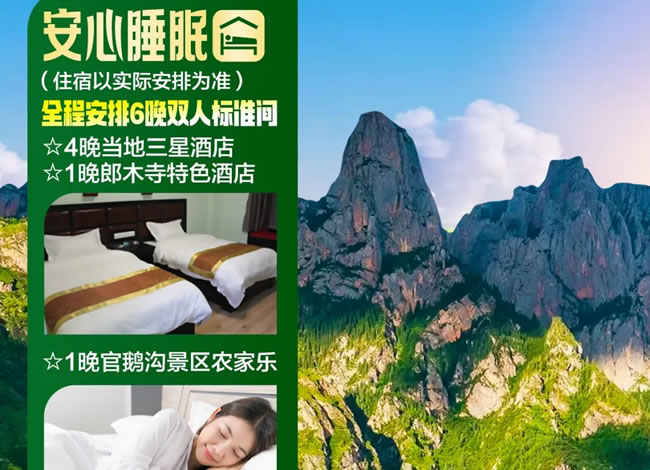3、住宿:全程5晚商務型雙人標準間+1晚官鵝溝景區(qū)為農(nóng)家樂。(以實際安排為準)