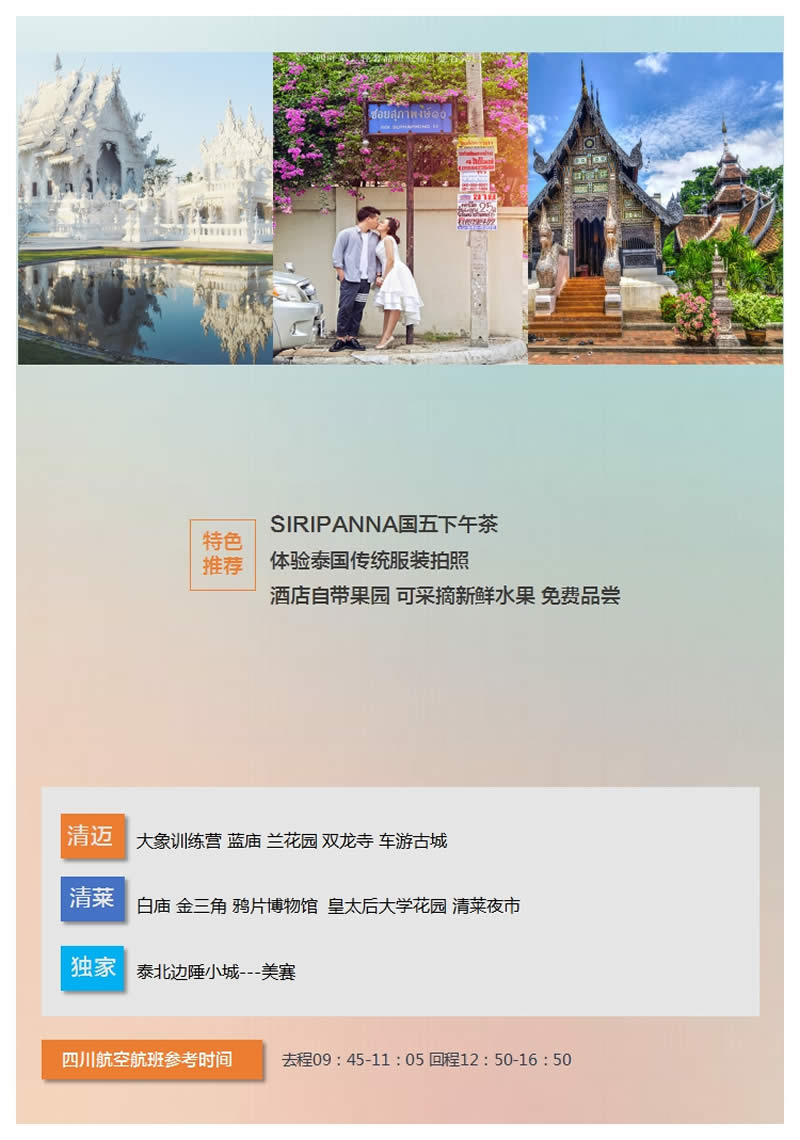 早餐后前往清邁機(jī)場(chǎng)乘坐飛機(jī)返回成都,結(jié)束愉快的旅程!